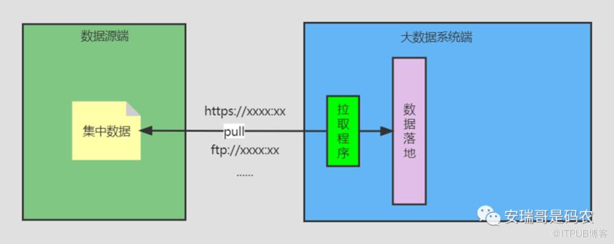 这个时候就是大数据系统端通过程序,直接请求数据源端的数据,将其拉入到大数据系统端,接入程序部署在大数据系统端。
