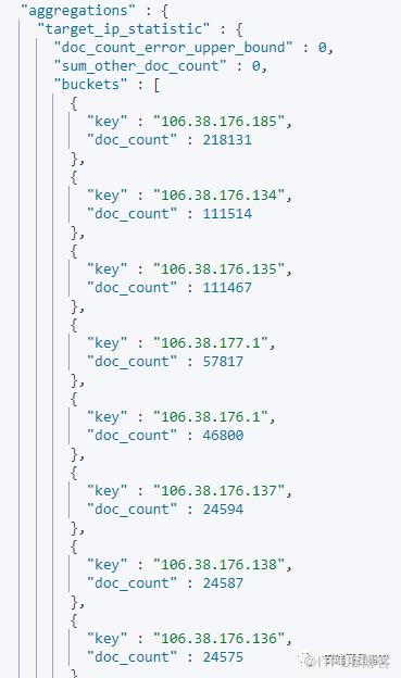 从这个查询结果就可以知道,每个target_ip被访问了多少次(一个文档记录就代表一次),看到这个查询效果,你是不是瞬间觉得:我擦,这也太方便了吧,那我以后所有对数据的聚合统计分析岂不是只需要将原始数据直接灌到ES,然后通过各种聚合查询就能瞬间查出来。