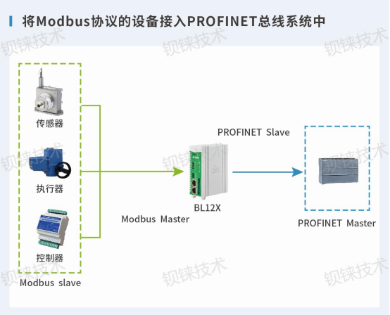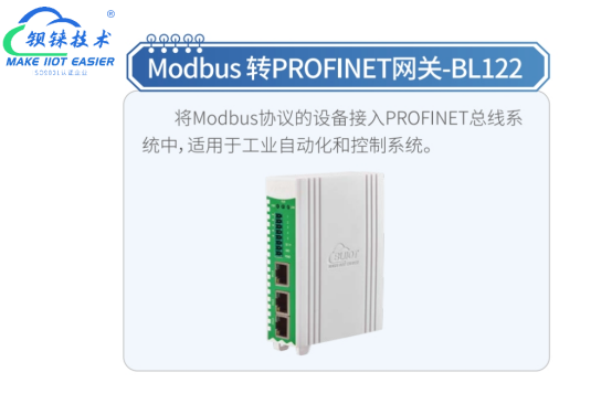 BL122 PROFINET 网关的作用: 工业自动化场景的协议转换,通过网关将 Modbus 的设备对接至 PROFINET 的系统中。