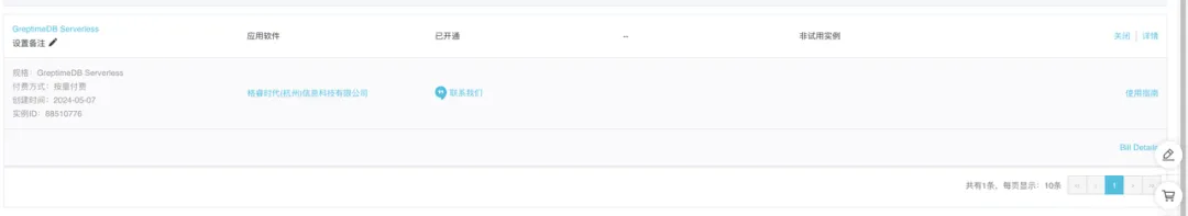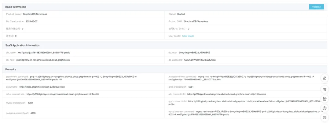 当状态变成已开通后,即可点击详情进入详情页面,查看 GreptimeDB 的链接信息。