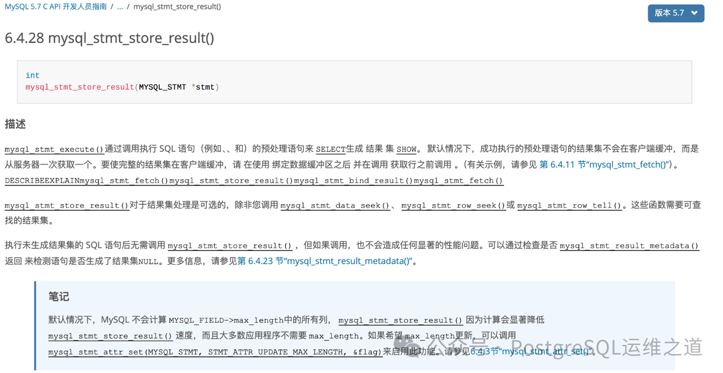 这就涉及到MySQL的C-Api函数了,翻阅了源码和文档,当调用mysql_stmt_attr_set(MYSQL_STMT, STMT_ATTR_UPDATE_MAX_LENGTH, &flag)做了配置后,mysql_stmt_store_result(MYSQL_STMT *stmt)就可以更新metadata记录结果的field->max_length
