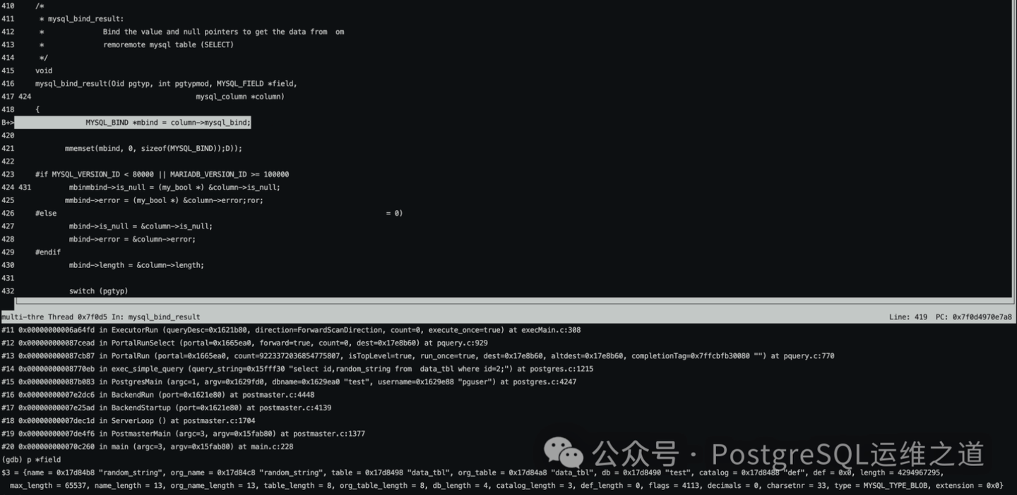 random_string是text类型的,根据我们对mysql_fdw原理的了解,我预感问题应该出在从MySQL查询到结果mysql_fdw转换为PG数据格式返回结果这个阶段。
