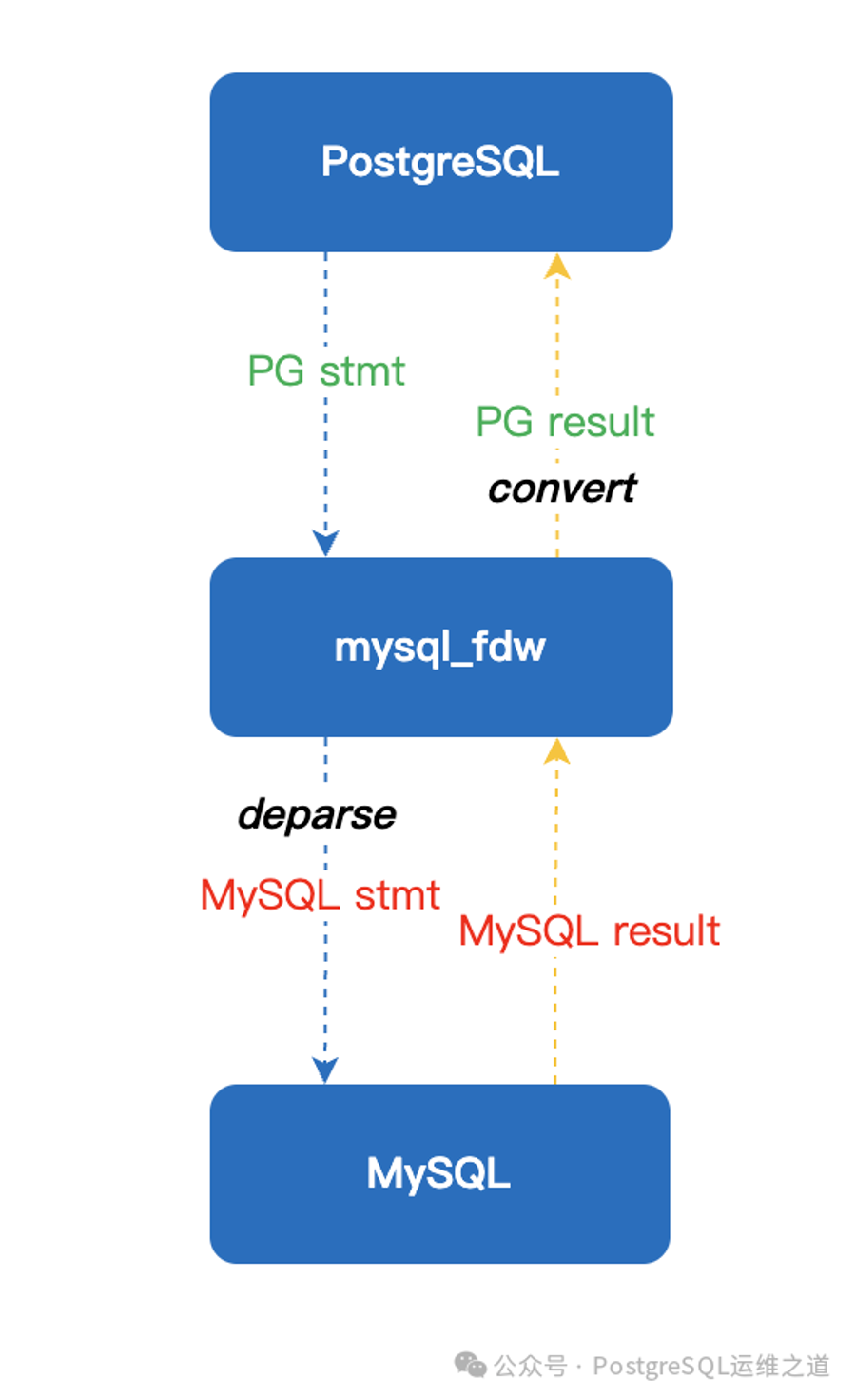 简单总结下原理:MySQL_fdw将PG的SQL语句deparse为mysql的SQL语句,调用封装的mysql C-Api连接MySQL数据库执行SQL,获取结果后convert为PG对应的数据格式,返回给PG数据库客户端。