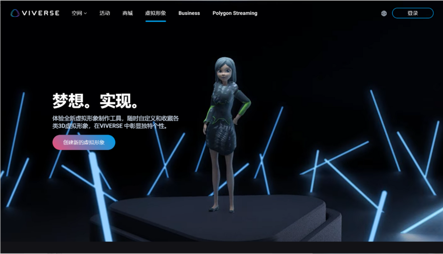 2、在进入官网后点击顶部菜单栏中的【虚拟形象】,进入新页面后点击【创建新的虚拟形象】,使用HTC账号登陆VIVERSE(没有HTC账号可注册账号后再登录)。