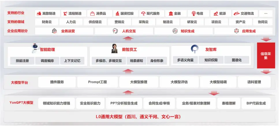 用友BIP作为一款为企业数智化而生的产品,引领企业AI应用创新发展。2023年,用友发布业界首企业服务大模型YonGPT。YonGPT用友企业服务大模型,是用友融合企业各个领域专业知识和各类行业商业KnowHow,经过大量业务数据的预训练和精调的企业服务大模型,帮助企业实现智能化的业务运营、自然化的人机交互、智慧化的知识生成、语义化的应用生成四大能力,为企业提供智能化的人机协作、业务洞察、商业决策支持和智能运营服务, 是深懂企业服务的垂类大模型。