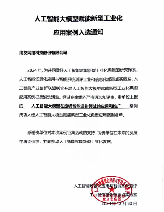 近日,工业和信息化部重点实验室发布人工智能大模型赋能新型工业化应用案例名单。面向工业企业痛点需求探索开展融合应用,为大模型在工业领域的深化应用提供新思路和新方向。用友网络科技股份有限公司申报的“人工智能大模型在废钢智能识别领域的应用和推广”案例成功入选。