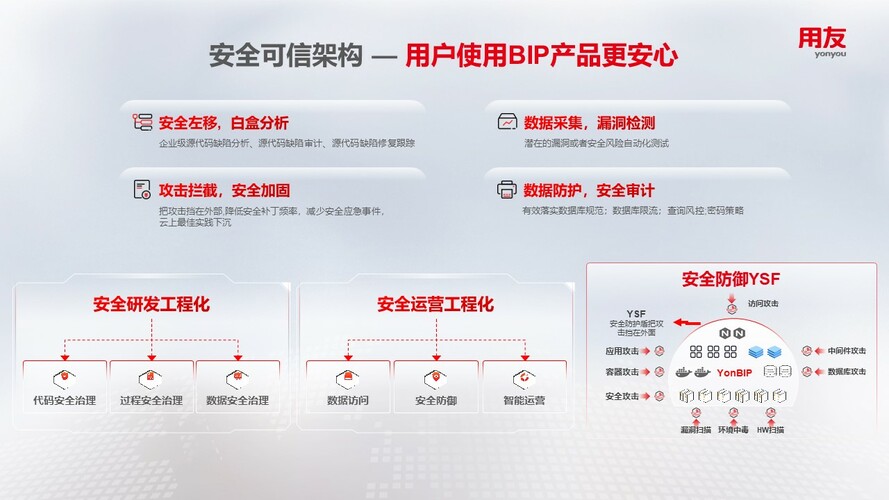 用友BIP 作为全球领先的企业软件与智能服务平台, 凭借深厚的技术积累与丰富的行业经验, 形成了成熟和完整的融合服务群,包括平台层(数智底座)、领域应用与服务层、生态应用与服务层 。在提供涵盖财务、人力、供应链等多领域的智能化解决方案的同时, 用友 B IP将安全能力深度融入产品与服务的全生命周期。 用友 iuap作为用友B IP 的 P aaS 底座,通过设置安全性机制、稳定性机制、高效弹性机制、开放兼容性机制、云上云下一体多环境发布机制等,让产品运行更安全、更稳定、更高效。