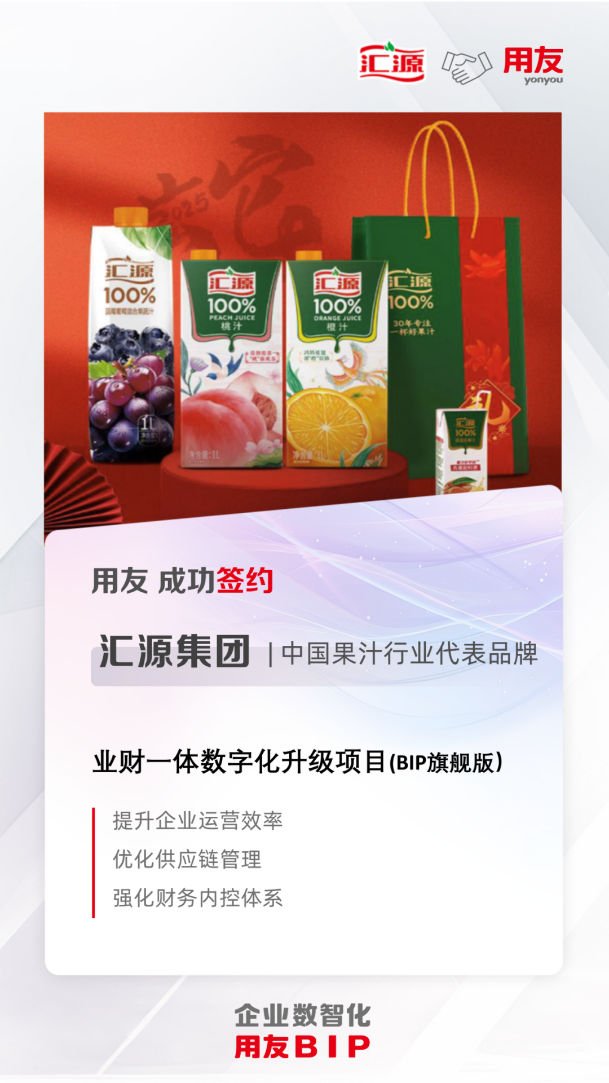 近日,用友成功签约北京汇源食品饮料有限公司(以下简称:汇源)业财一体数字化升级项目。本次项目将基于用友 BIP,通过数智化手段提升汇源数字化营销能力、优化供应链管理、强化财务内控体系,为汇源实现高质量跨越式发展提供坚实支撑。