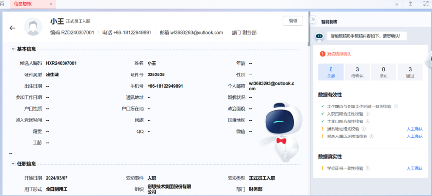 员工信息智能复核可 7*24不间断运行,即便 HR人员变动,智能复核工作不受影响,确保企业在人事调整等情况下,员工信息管理工作平稳过渡,保障业务持续正常运转。