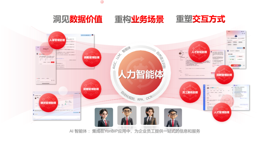 用友 BIP人力云的 AI 功能为企业人力资源领域带来一系列创新变革。在智能信息采集与复核场景中,员工填写信息时,系统能自动识别关键附件内容并填充至采集表,同时实时复核,一旦发现问题即刻为员工提供引导,助力及时修正;HR复核时,系统精准定位问题,生成专业驳回意见。而在人事数据智能查询场景下,企业内HR 、 业务经理、招聘经理等不同层级人员,仅需与智能体展开简单自然的对话,便可迅速获取所需人事数据。
