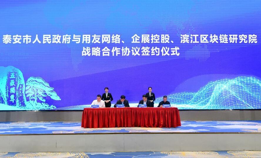 会议期间 ,用友网络科技股份有限公司(简称用友)与泰安市人民政府、 企展控股有限公司、杭州高新区(滨江)区块链与数据安全研究院签署四方《战略合作协议》。同时 ,用友与泰安市泰山财金投资集团有限公司、企展控股有限公司、杭州高新区(滨江)区块链与数据安 全研究院签署四方《首批项目合作协议》。未来 ,用友将与财金集团、企展控股、杭州高新区(滨江)区块链与数据安全研究院共同在数据要素运营、数据资产认证登记评价中心、服务政府和企业数智化发展、构建泰山资产链等重点领域开展合作。