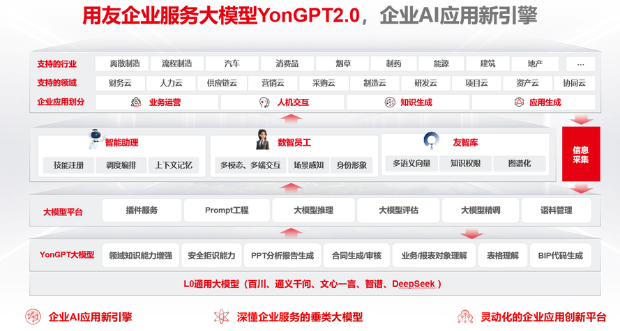 特别值得一提的是,近年来越来越火的 A I 技术正加速延伸到企业众多丰富的业务场景。 用友 在 2023年发布 了 企业服务垂类大模型YonGPT ,并且 在企业数智化应用与服务方面不断创新 。 2 024 年, 基于智能体、人机交互、知识增强等应用框架, 还 推出了 “智友”“友智库”“数智员工”等智能平台产品,并开发了100多项智能应用,覆盖财务、人力、供应链等企业服务领域。 而率先接入 DeepSeek,让 用友BIP 的 智能服务 进一步得到加速 升级 。 YonGPT 整合各种大模型,嵌入核心业务,通过国产大模型加国产软件的方式,为客户提供实时的智能运营服务。而企业 在获得更强模型能力的同时, 能够 显著降低算力成本 ,充分释放企业的潜能。