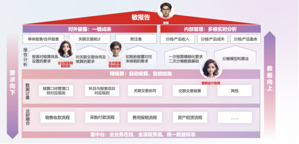 • 数据服务层 : 结合大模型、大数据算法,进行报表合并、预算预测、多维度分析,以及 从 财务到业务 的 动因追溯, 进行 深度数据挖掘与智能展现 。