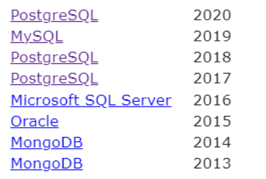 不过这些年 P G 数据库已经逐渐赶上来了。大家可以看到从 2013年开始P G 在 D B-ENGINES 上的只有不足 200分,到2021年底突破600分,P G 数据库只用了 8年时间。在最近几年的D B-ENGINES 的 D BMS OF THE YEAR 中, P G 摘取了 2017/2018/2020,M YSQL 摘取了 2019。不出意外的话,今年的D BMS OF THE YEAR 2021 又将被 P G 摘取。