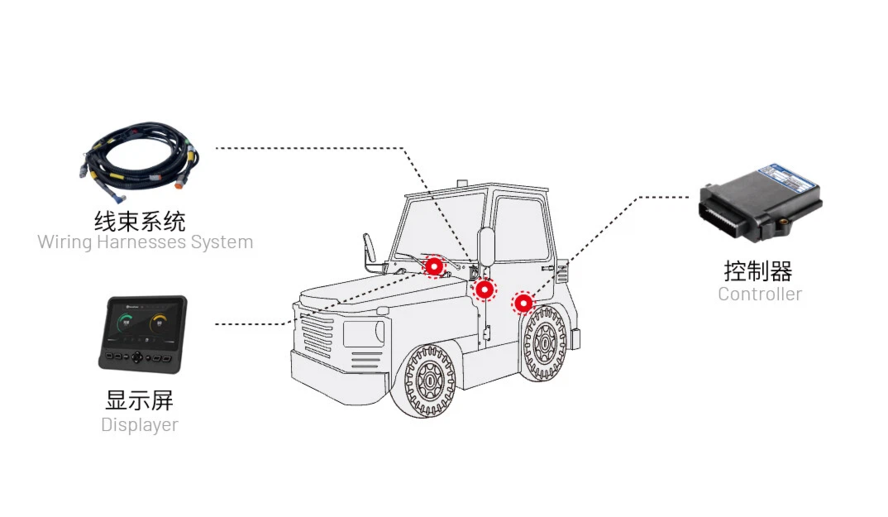 主体架构包括电池及BMS管理系统、驱动电机及冷却系统、转向油泵系统、各类工作阀门、传感器、开关组件。