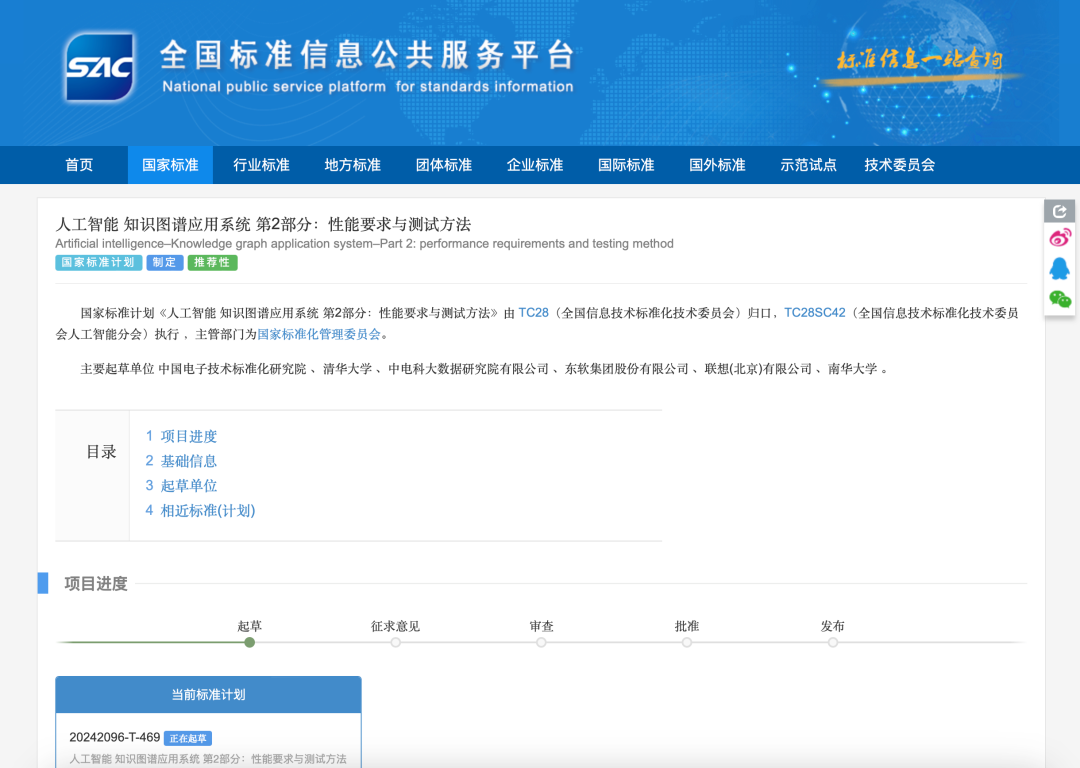全国信标委人工智能分委会知识图谱工作组,由中国电子技术标准化研究院牵头,联合知识图谱相关企事业单位、研究院所、高校、机构,旨在 开展知识图谱领域标准化顶层设计和标准化需求分析,推动国内相关标准研究、制定与推广,并支撑知识图谱相关国际标准化工作和 知识工程产业的高质量发展。