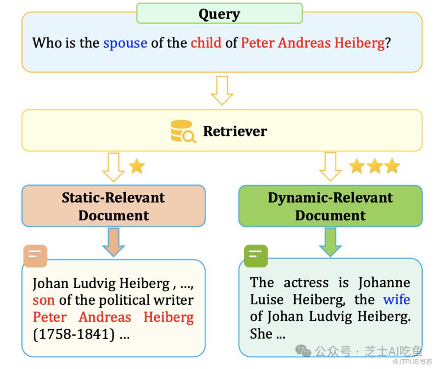 可以看到,动态相关文档和原始查询的直接关联度很低,因为知识库中关于"配偶"的内容太多。但如果把从静态文档中提取出的关键信息"Johan Ludvig Heiberg"再拼接到查询中,就能准确地检索出与之最相关的动态文档了。