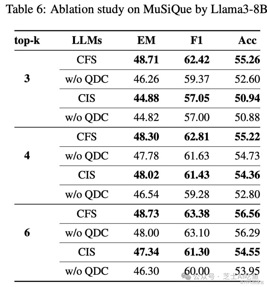 此外,通过消融实验分别验证了QDC、CIS和CFS三个模块的有效性。表2展示了它们在MuSiQue数据集上的效果:
