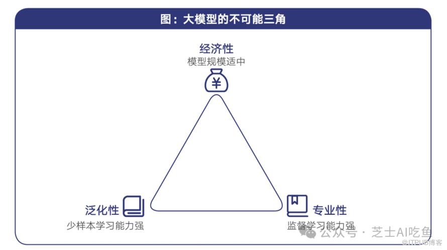 尽管通用大模型在泛化能力上取得了显著成就,但它们在专业性、泛化性和经济性之间难以平衡,即所谓的"不可能三角"问题: