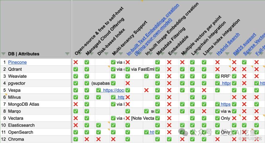 为了比较众多向量数据库产品,需要借助一个特性矩阵来突出不同向量数据库之间的差异,并指导在不同场景下选择合适的数据库。