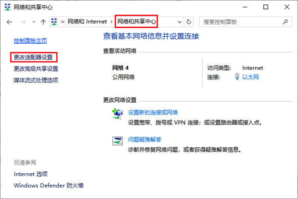2、点击“网络和共享中心”,然后选择“更改适配器设置”。