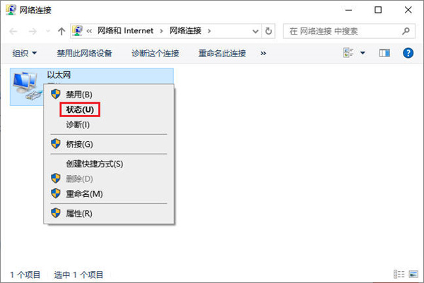 3、找到当前使用的网络连接,右键点击并选择“状态”。