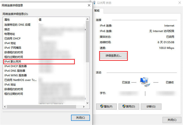 4、在弹出的窗口中点击“详细信息”,找到“默认网关”一栏即可查看。