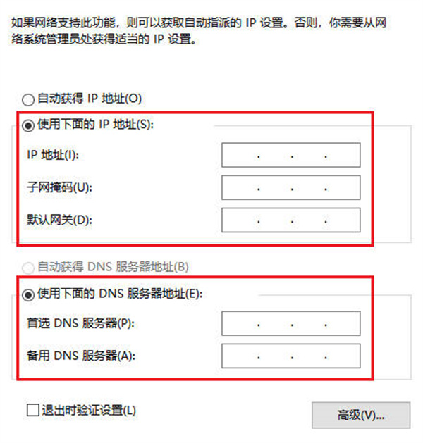如果你需要手动指定IP地址,应选择“使用下面的IP地址”选项,并填写相应的IP地址、子网掩码、默认网关和DNS服务器地址。