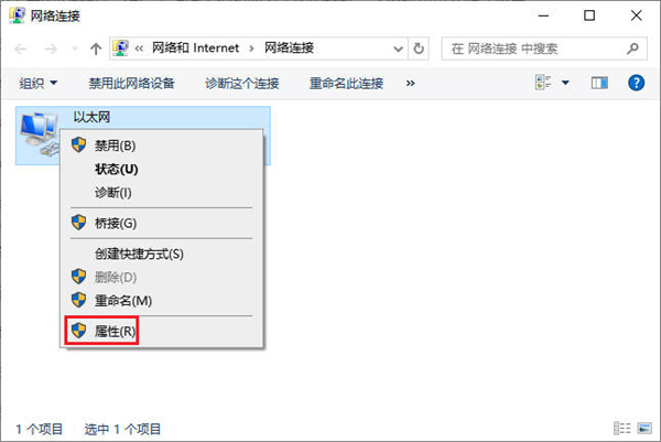 - 在网络连接列表中,右键点击当前使用的有线/无线连接,选“属性”。