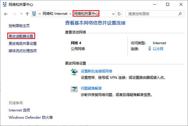 - 进入“网络和共享中心”,找到并点击“更改适配器设置”。