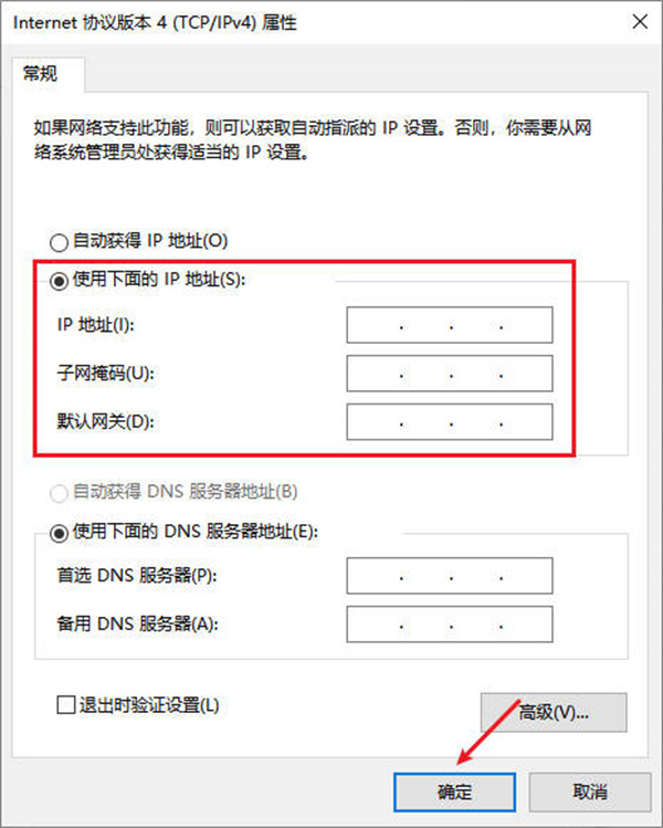 - 选择“使用下面的IP地址”,然后手动输入您想要设置的IP地址、子网掩码以及默认网关,点击“确定”保存设置,完成IP地址的更改。