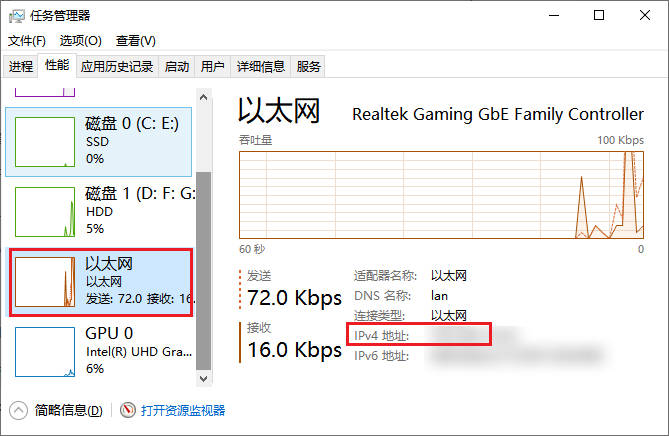 - 切换到“性能”标签→选择网络适配器(以太网等)。