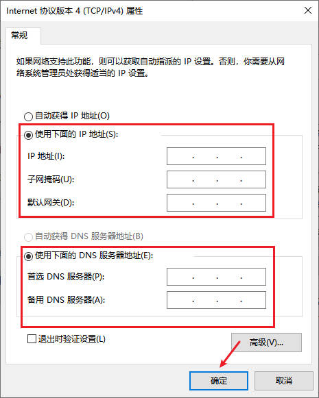 - 选择“使用下面的IP地址”并输入新IP,点击“确定”。