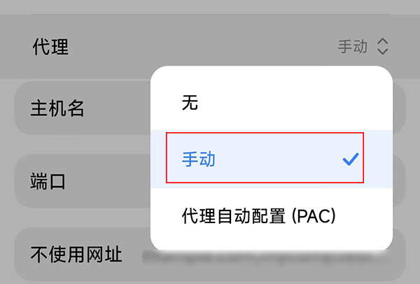 以Android设备为例,打开【设置】→【Wi-Fi】,长按已连接网络→选择【修改网络】,展开【高级选项】→选择【代理】为【手动】, 输入代理IP和端口后保存。