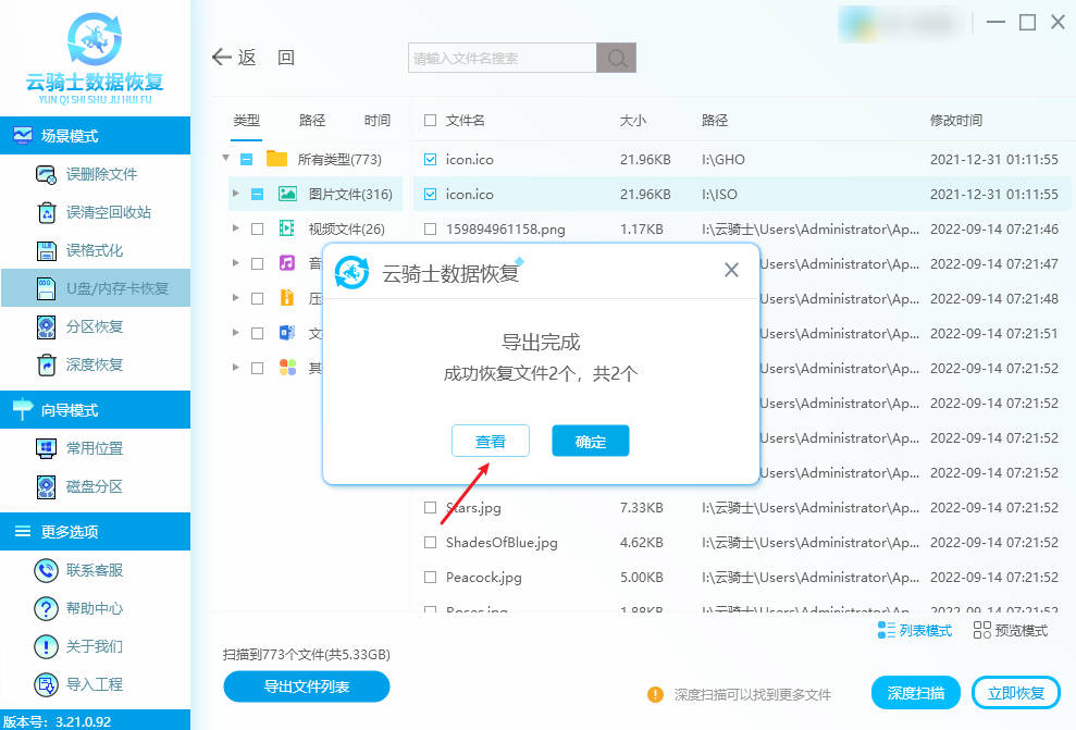查看恢复的数据:点击“确定”按钮,等待数据导出完成,导出完成后,点击“查看”即可快速查阅恢复好的数据。