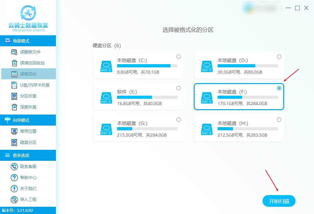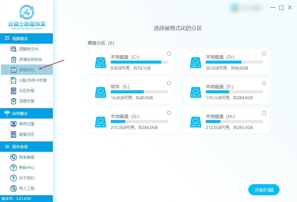 步骤1:下载并安装云骑士数据恢复软件,注意避免安装在丢失数据的磁盘上,打开软件,选择“场景模式”下的“误格式化”选项。