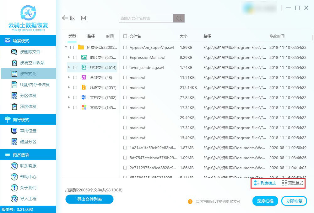 市场上存在多种数据恢复软件,它们能够能识别并提取出被初始化后但仍未被覆盖的硬盘数据。但任何软件都无法保证100%的恢复成功率,因此,我们可以优先选用支持免费扫描和预览的数据恢复软件,如专业的云骑士数据恢复软件,能有效预判文件可恢复性。接下来,将为您呈现一套适用于高级格式化后数据恢复的步骤: