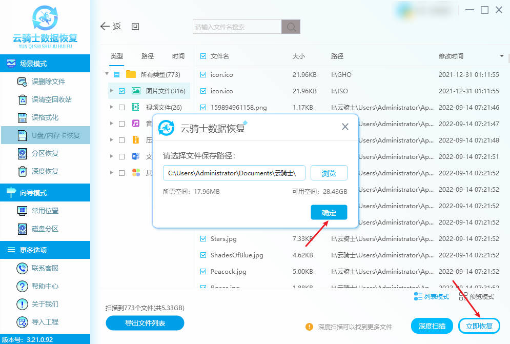 软件版本:云骑士数据恢复软件 3.21.0.92
