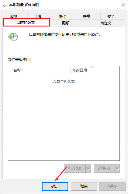 2、切换至“以前的版本”选项卡,找到D盘格式化之前的版本,点击“确认”进行恢复。