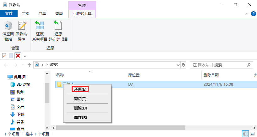 步骤3:找到目标文件后,右键单击文件,在弹出的菜单中选择“还原”选项,文件将自动恢复到其原始位。