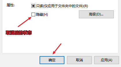 3、取消隐藏属性:此时,隐藏的文件夹/文件将以透明状态显示。通过右键点击这些文件,选择“属性”,然后在属性界面中取消“隐藏”前的勾选框,点击“确定”即可恢复显示。