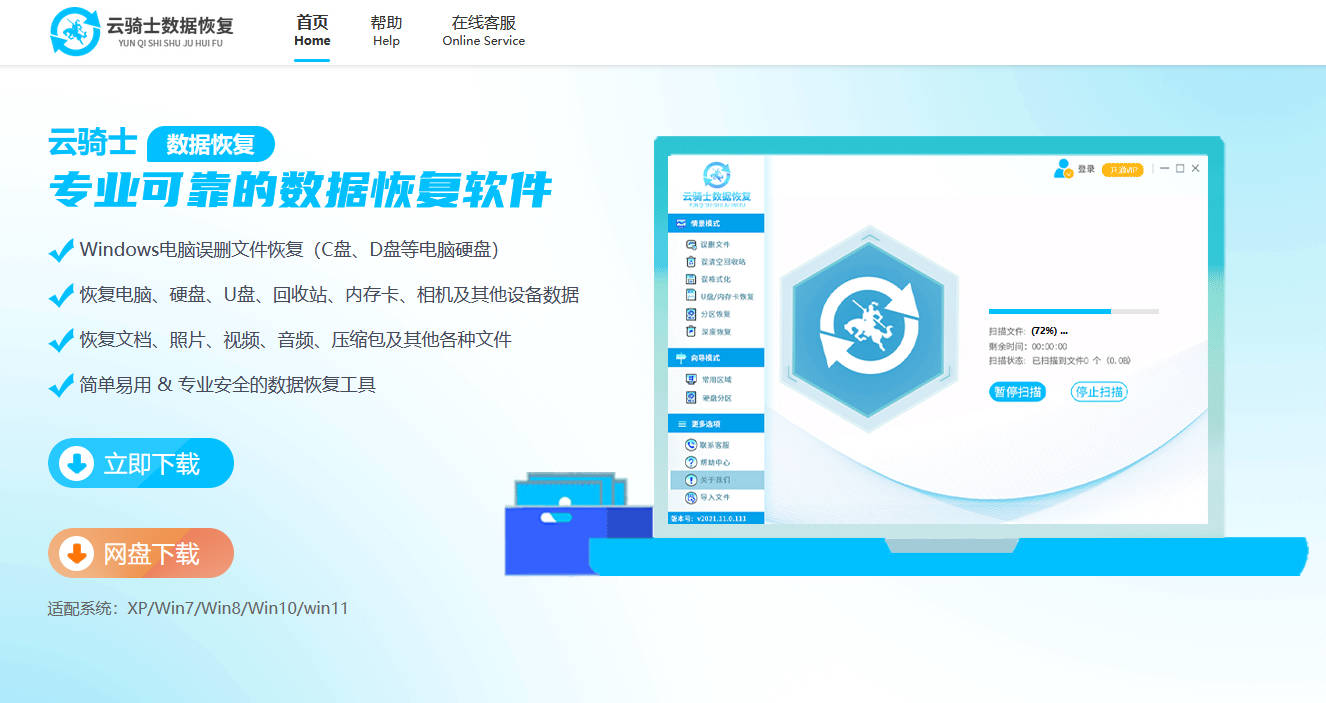 1、正确连接U盘:将U盘正确连接上电脑,然后打开已在XP/Win7/Win8/Win10/win11电脑系统上安装好的云骑士数据恢复软件。