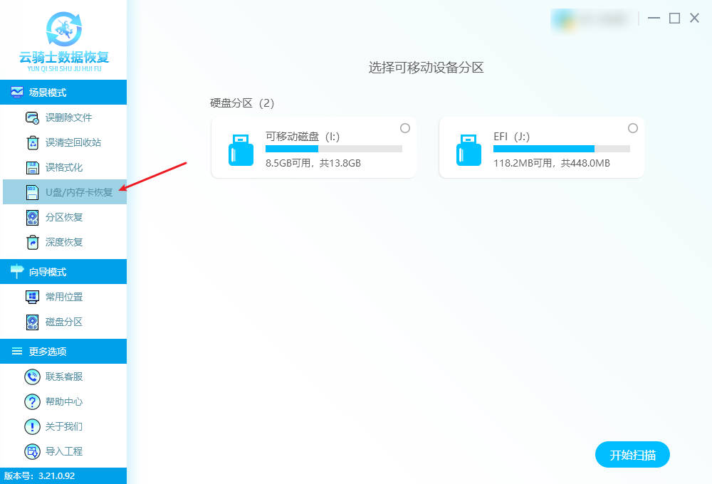 2、选择恢复模式:在软件界面中,选择合适的恢复模式,如场景模式中的“U盘/内存卡恢复”选项。