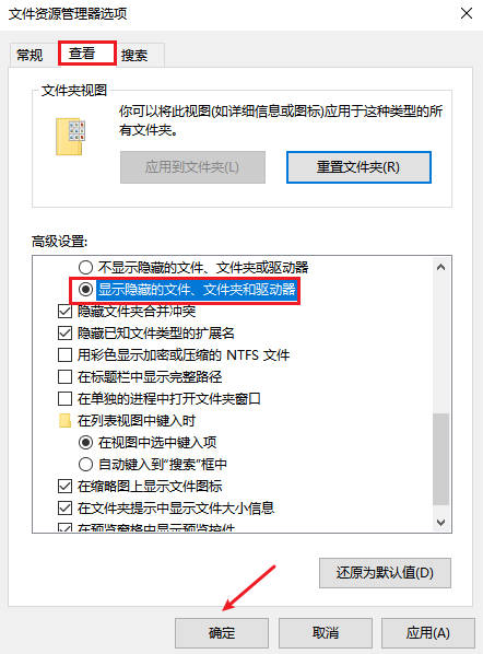 3、在文件资源管理器选项窗口中,切换到“查看”选项卡,勾选“显示隐藏的文件、文件夹和驱动器”,然后点击“确定”按钮。