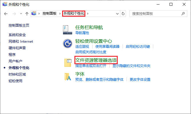 2、在控制面板界面中,找到并点击“外观和个性化”,然后在子菜单中选择“文件资源管理器选项”。