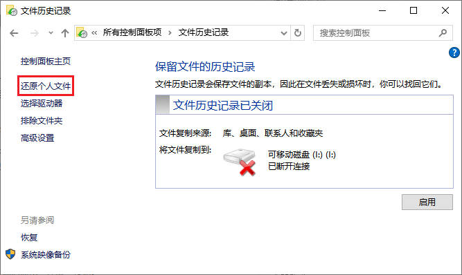 - 如果已启用文件历史记录功能,可以通过控制面板进入“系统和安全”选项,然后点击“文件历史记录”来尝试恢复被删除的文件。