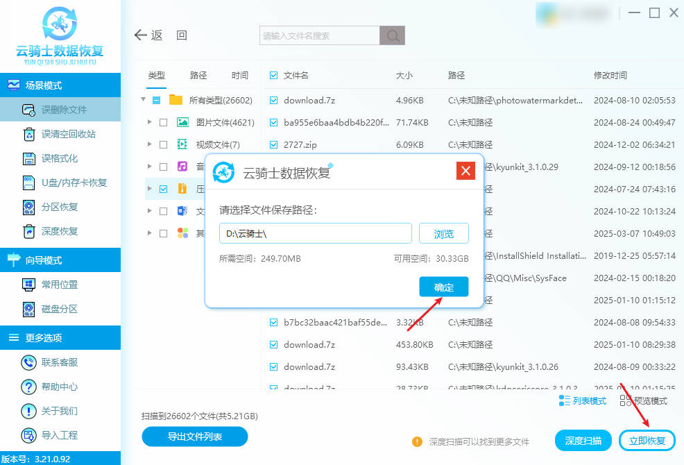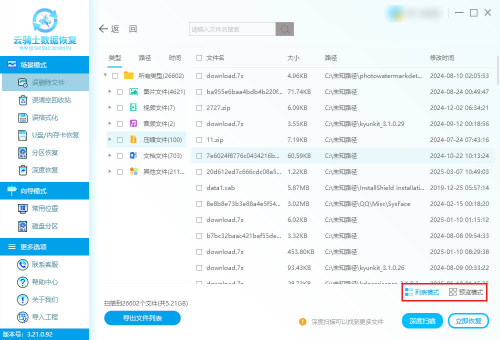 如果上述尝试均未能找回丢失的文件,且没有提前进行备份,您可以借助专业的数据恢复软件来尝试恢复。接下来,我们将以广受好评的云骑士数据恢复软件为例,为您展示具体操作步骤: