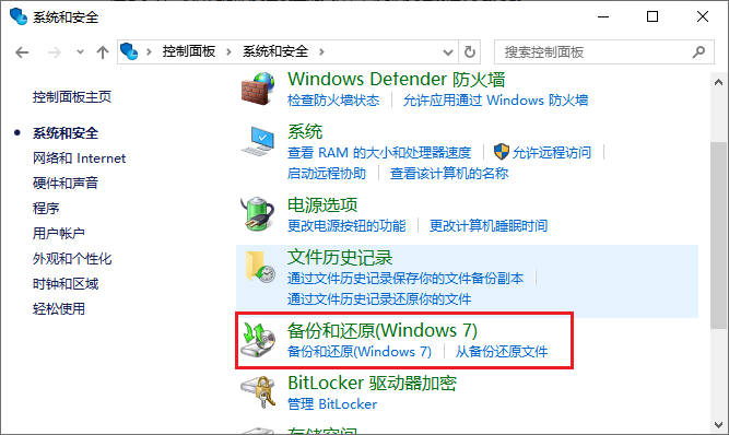 - 打开控制面板,选择【系统和安全】>【备份和还原】。