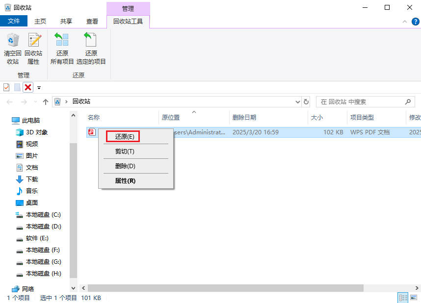 - 选中需要恢复的文件,右键点击,选择“还原”即可。