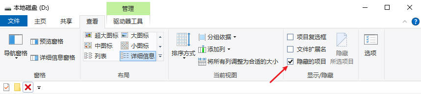 - 在“显示/隐藏”组中,勾选“隐藏的项目”选项。此时,隐藏的文件夹和文件应该会显示出来。